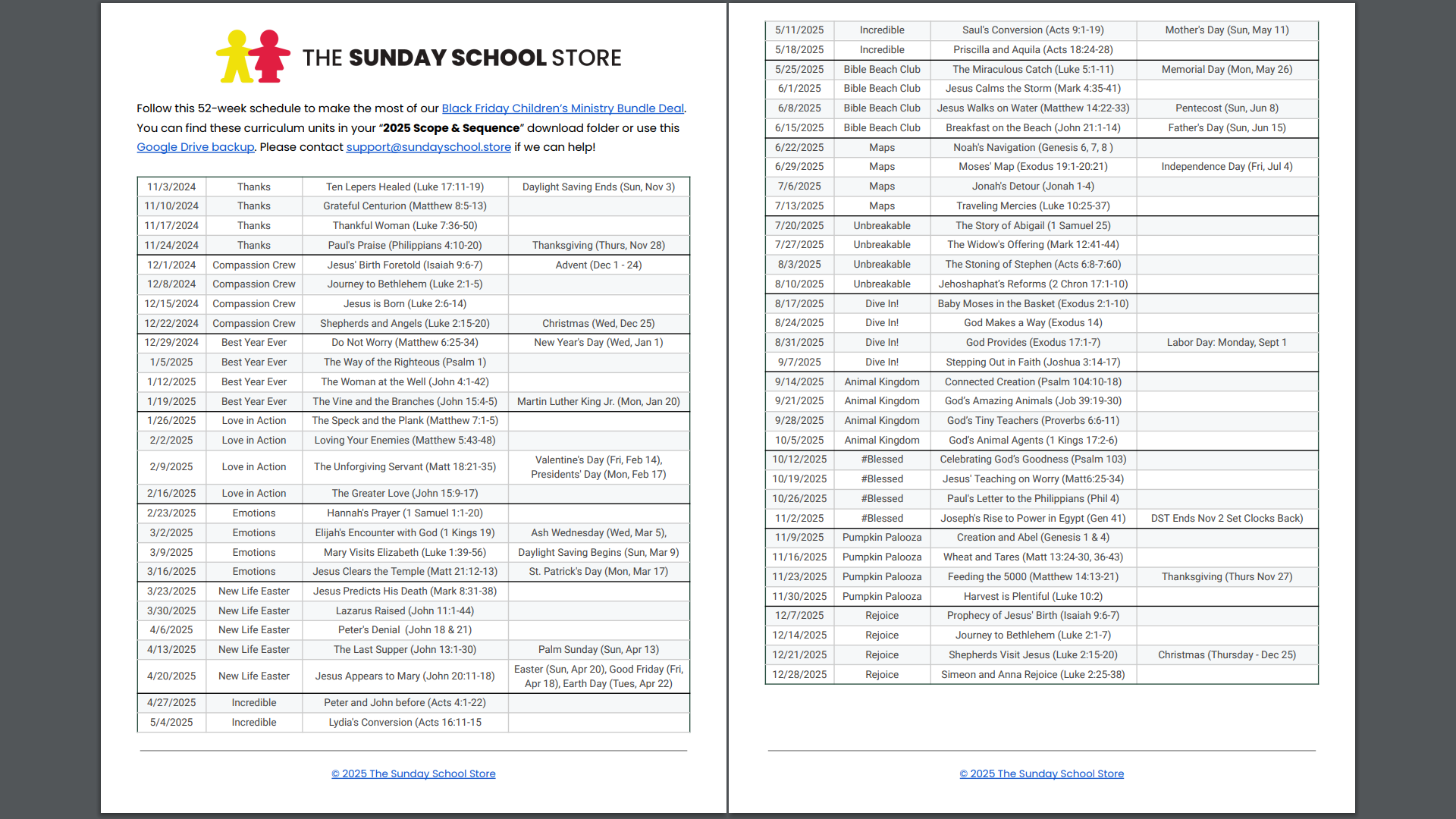 Don't start the ministry year without a plan. Save time and money with our 52-Week Curriculum Bundle for your Sunday School or Children's Ministry. We include a weekly teaching schedule and print-ready Bible lessons for every Sunday from January to December 2025.