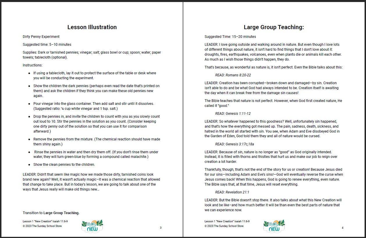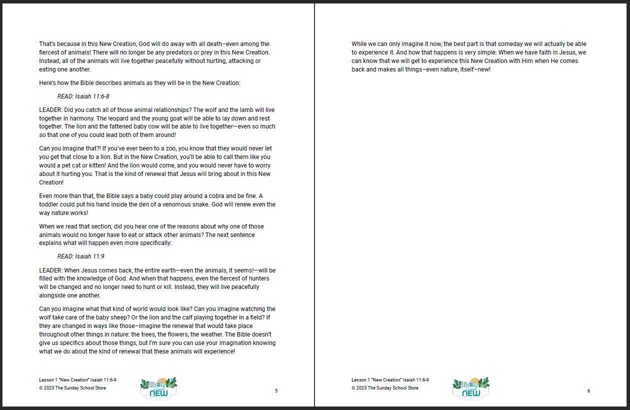 - “New Creation” Isaiah 11:6-9. This week, we will explore how the renewal Jesus brings at his Second Coming will affect nature itself in the New Creation. We will look at the current state of creation and compare that with God’s original design when He called it “good.”Â