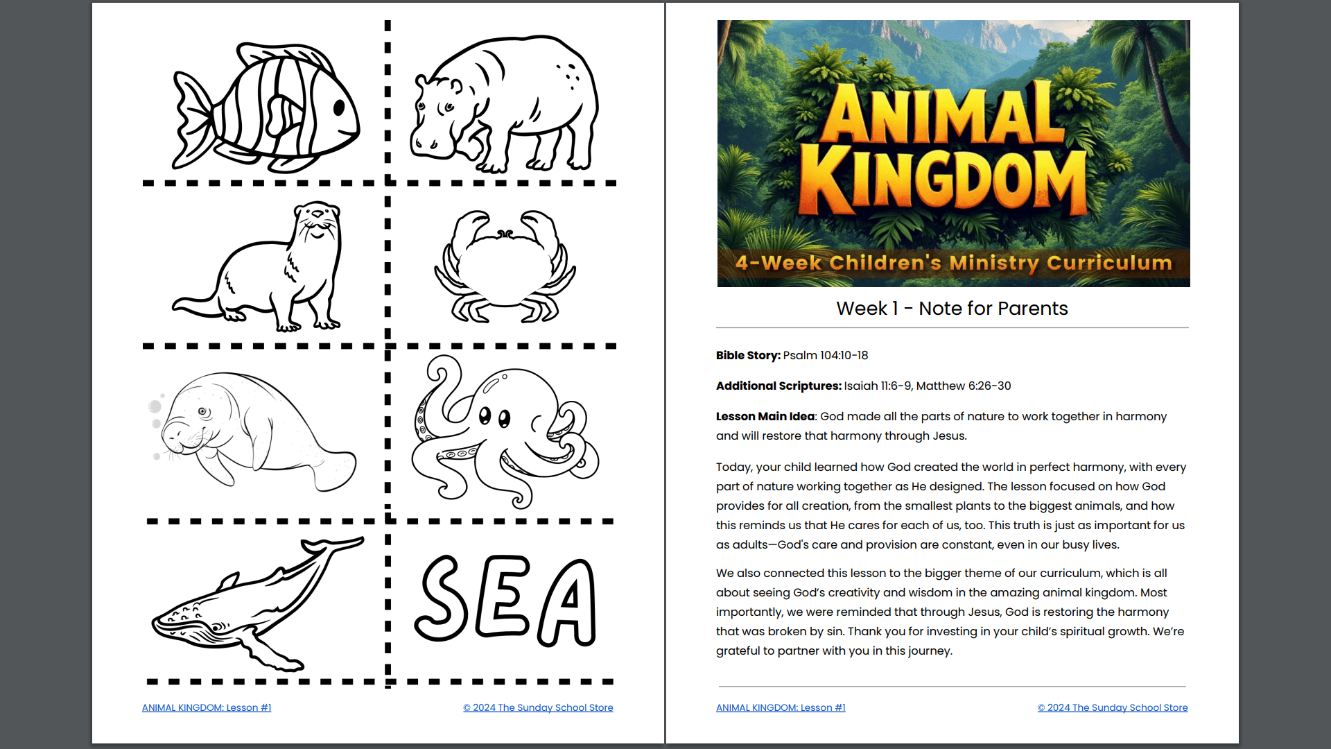 "Animal Kingdom: 4-Week Children’s Ministry Curriculum" teaches about God's incredible creativity and wisdom through His amazing creatures. This fun series helps children ages 6-12 see God's hand in every aspect of nature, deepening their love for Him and their wonder at His power.
