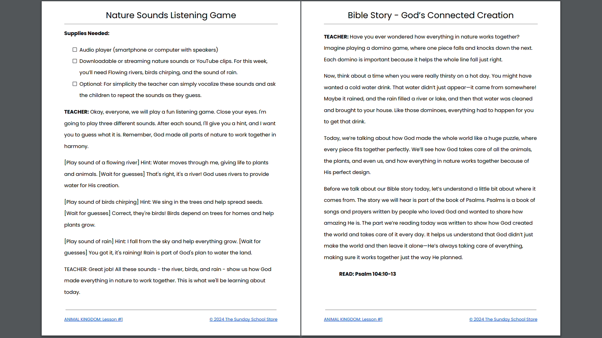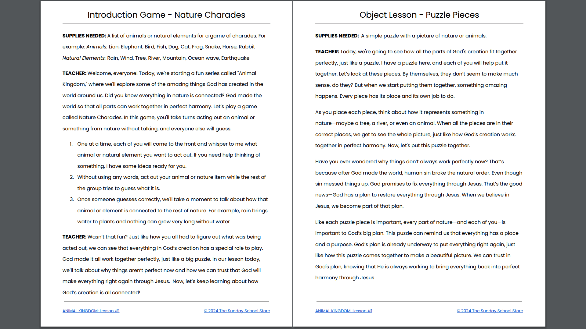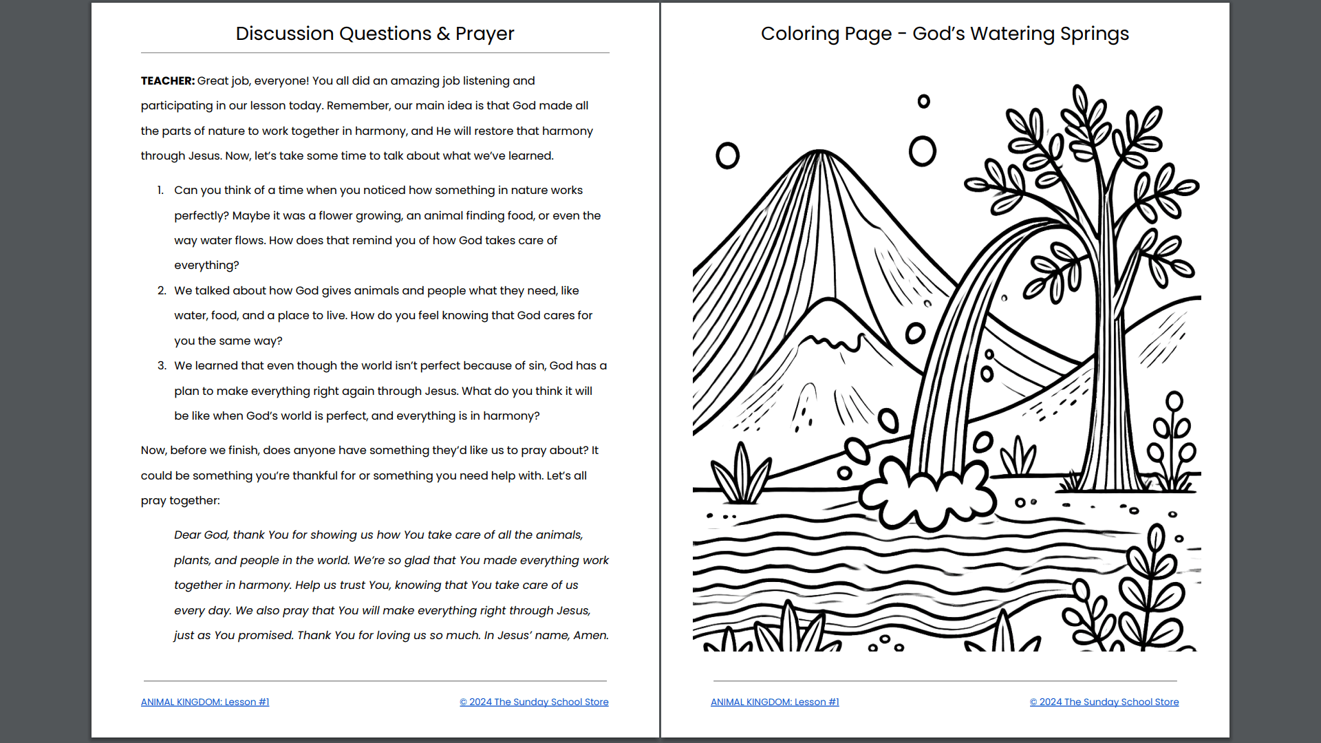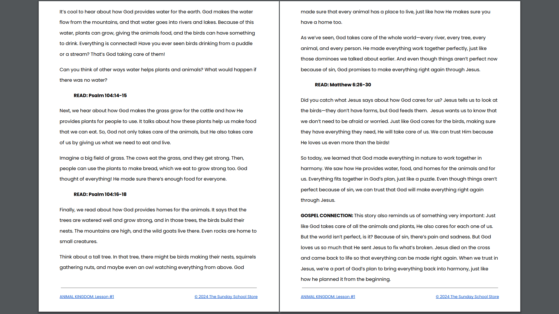 At the heart of "Animal Kingdom" is the message of God's love and redemption through Jesus Christ. While we marvel at God's creation, we consistently point children to the ultimate display of His love: Jesus' sacrifice on the cross. Each lesson connects the wonders of the animal world to God's plan of salvation, showing how Jesus came not just to save people, but to restore all of creation. We encourage children to develop a personal relationship with Jesus, emphasizing that the same God who designed each amazing animal wants to know them personally. Through engaging activities and discussions, we help kids see how trusting in Jesus and walking with Him daily allows them to fully appreciate and participate in God's ongoing work in the world. By the end of this series, children will understand that the God who cares for every creature cares infinitely more for them, inviting them into a lifelong journey of faith and discovery with Jesus as their guide and friend.