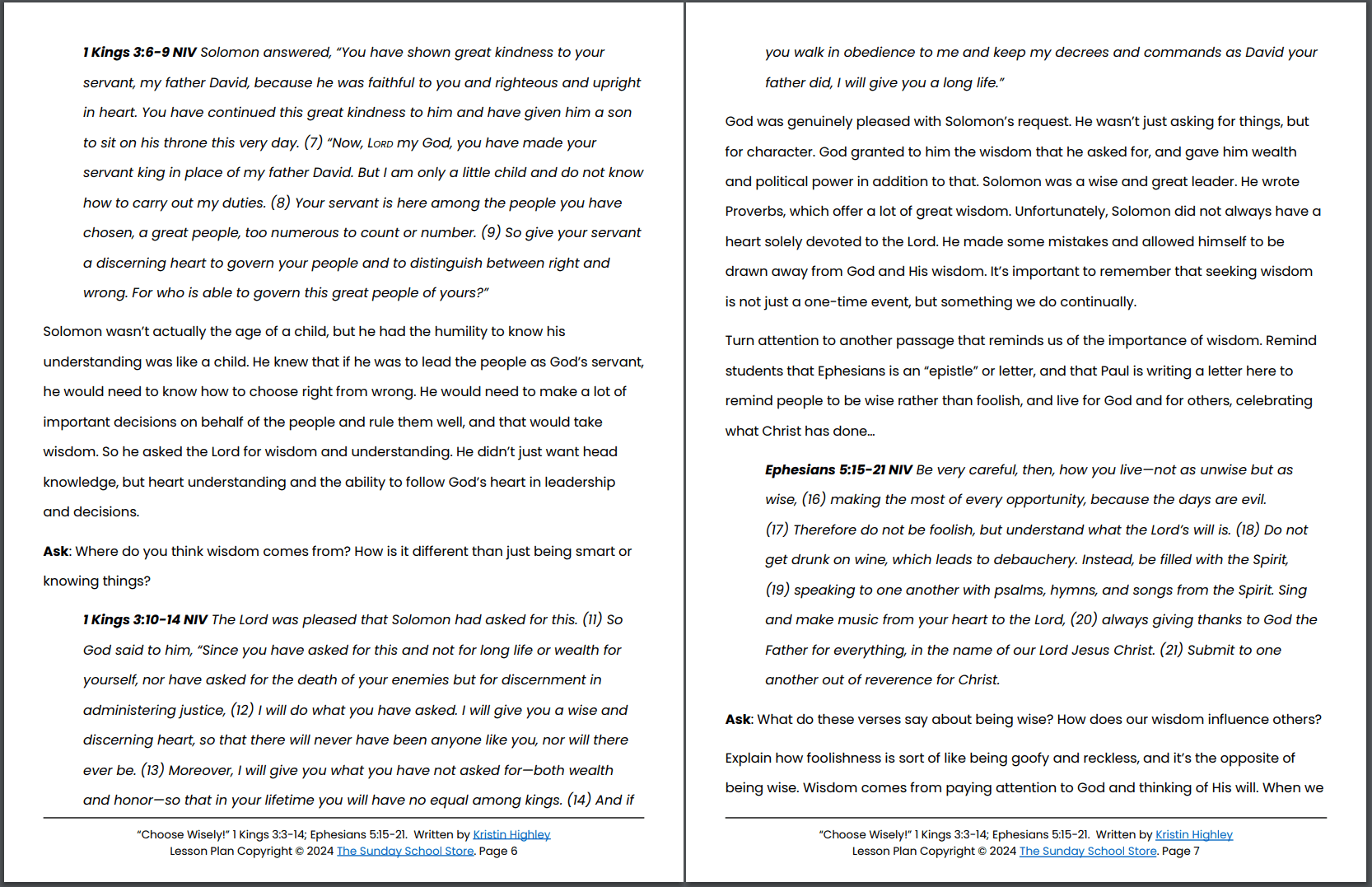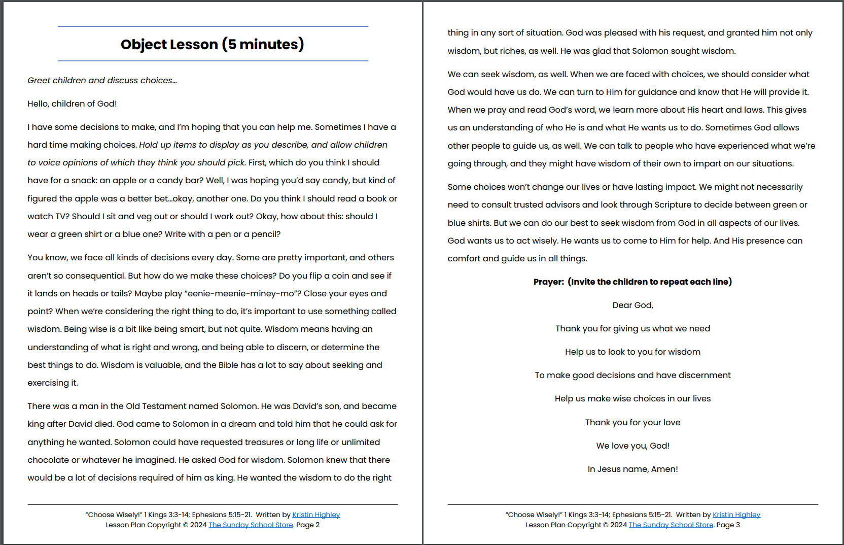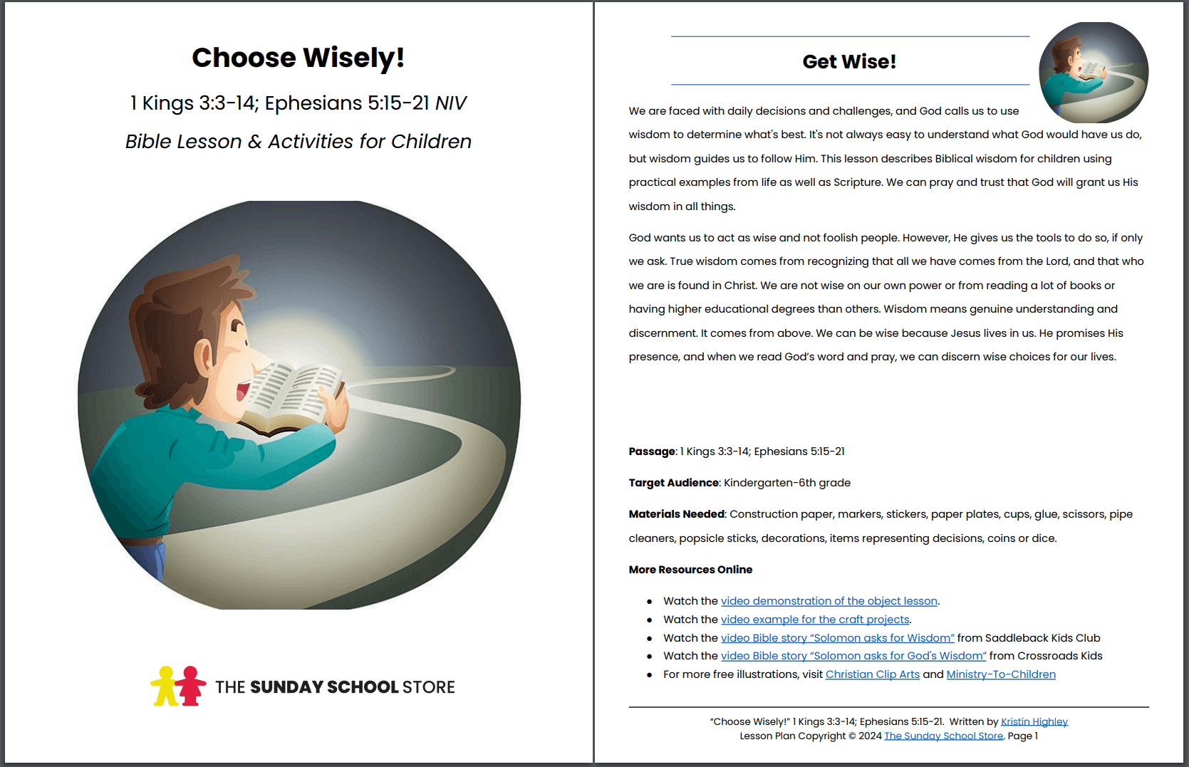 Choose Wisely! 1 Kings 3:3-14; Ephesians 5:15-21 Sunday School Lesson & Activities for Kids PDF