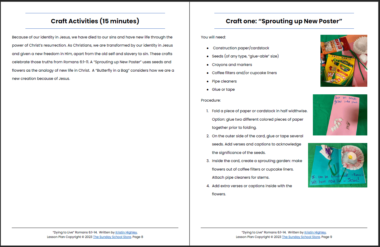 Hi everyone! As usual, this package of "Dying to Sin," did not disappoint. The story/message is spectacular, the craft and pages are engaging and the children of God love it. (So did the adults as I introduced it in the children's message.) Examples of food and insects is the tangible way to interact with this age of children. I introduced the food with real food and the students actually knew what they had transformed from. These kids nowadays are so smart. You need an interesting topic and good message to keep them in the know and interested. Sundayschoolworks, WORKS!
