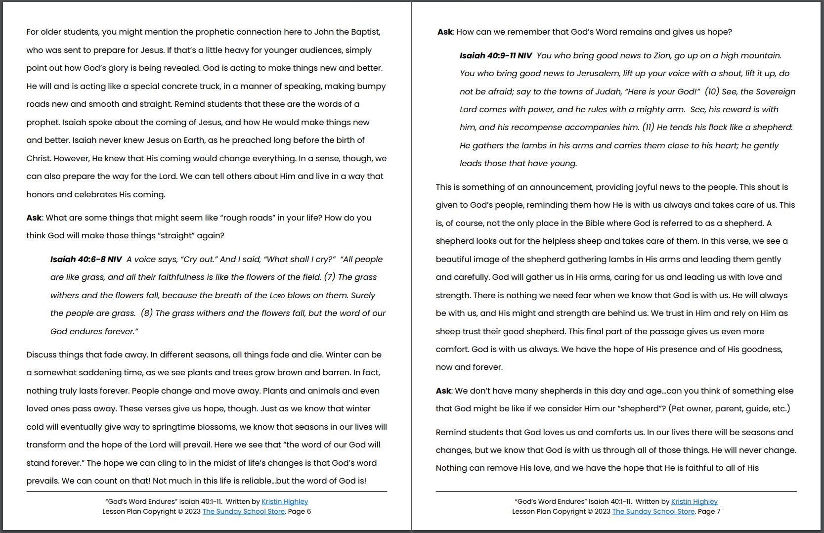 God’s Word is everlasting, reliable even when everything else in our lives changes or doesn’t last. The hopeful message of Isaiah 40 reminds us of this, promising that God will always be with us and that we can count on Him no matter what. God loves us and cares for us, nurturing His people like a shepherd and responding when we call. He wants to comfort us and give us His peace. This lesson highlights elements of the passage, including the “fading flowers” verse and the comfort component, to bring to life how marvelous our great God is in our lives.Â