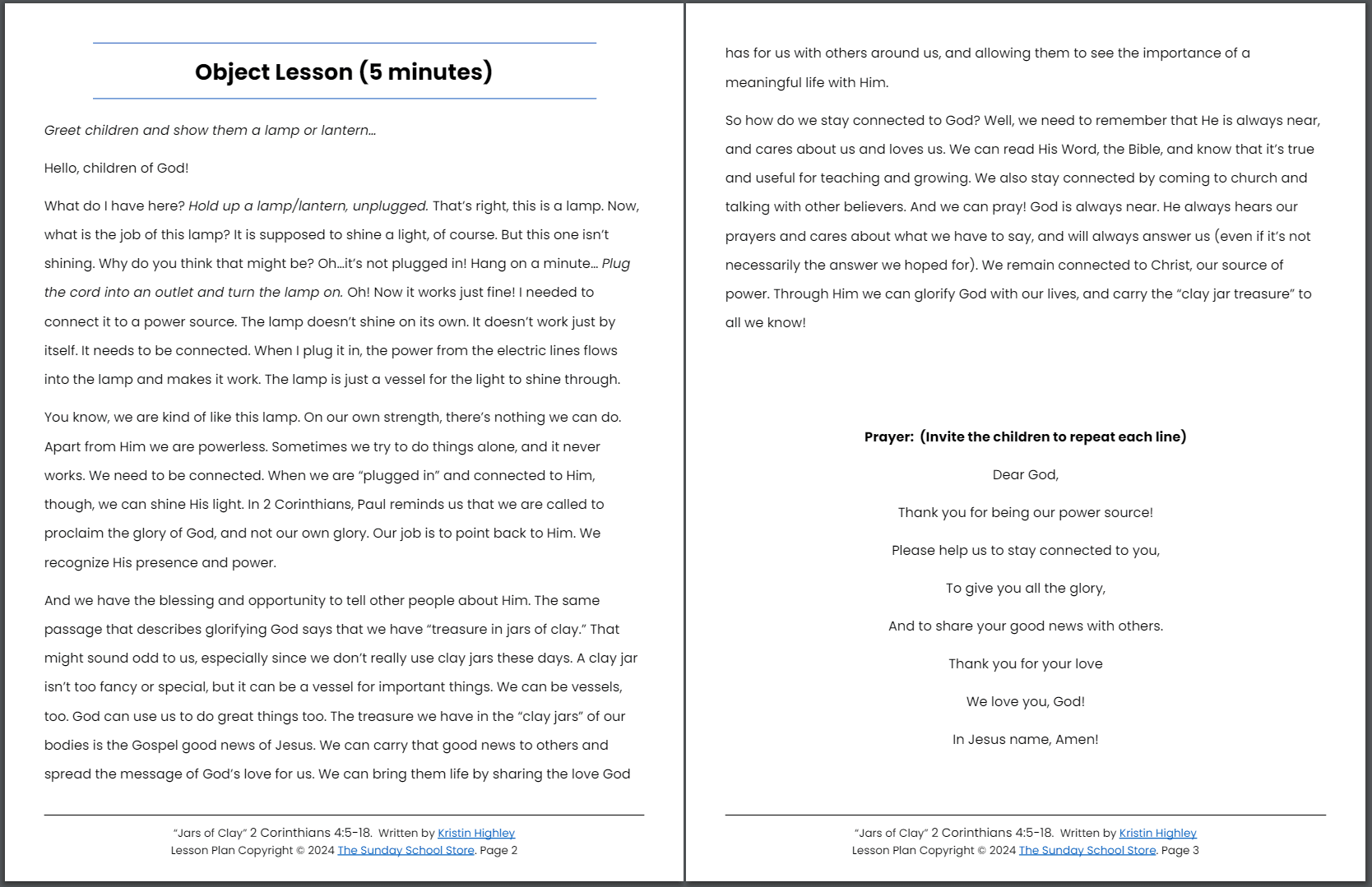 Sometimes our human nature tempts us to emphasize our own role in sharing God’s love or working with others. It’s important to remind children that we can do nothing apart from God’s power. He is the one who makes anything (and everything) possible, and His strength is what we should glorify and share with others. This lesson begins with a lamp to illustrate how essential it is to remain connected and “plugged in” to the Lord. Just as the lamp is a vessel for electricity that must be connected to a power source, we are vessels of the Gospel who must remain close to our power source, Jesus Christ!