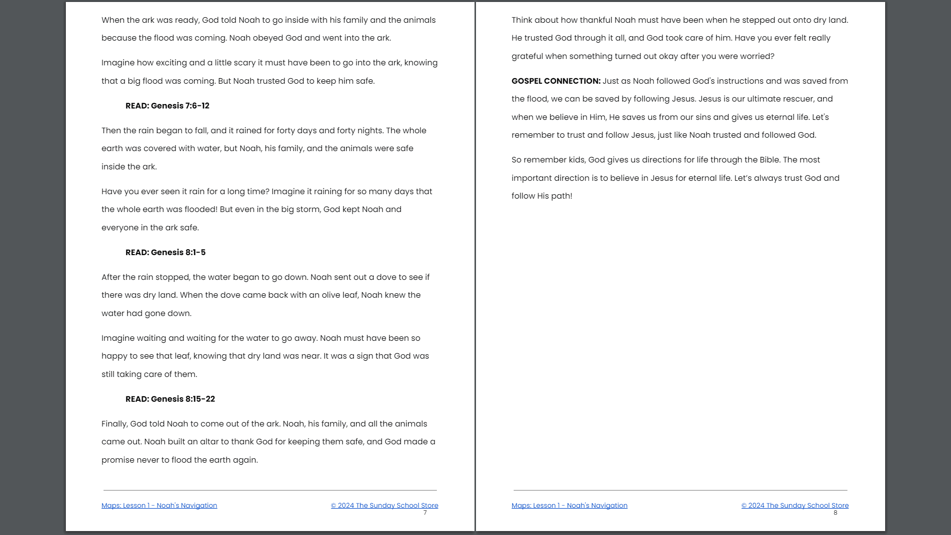 Gospel Connection: Just as Noah followed God's instructions and was saved from the flood, we are saved by following Jesus, who is our ultimate salvation. Jesus is the way to eternal life.