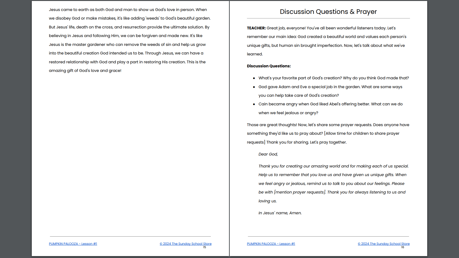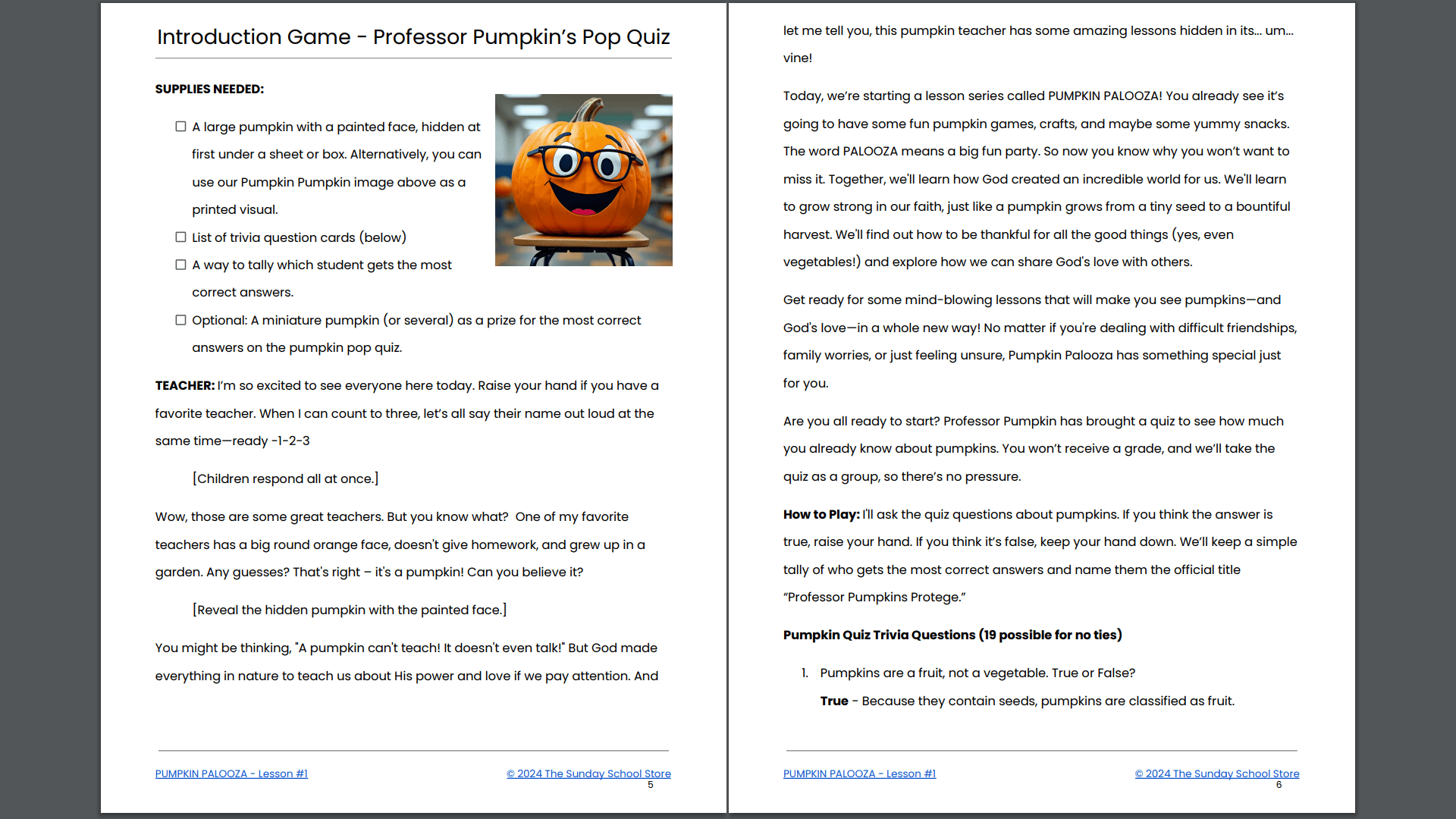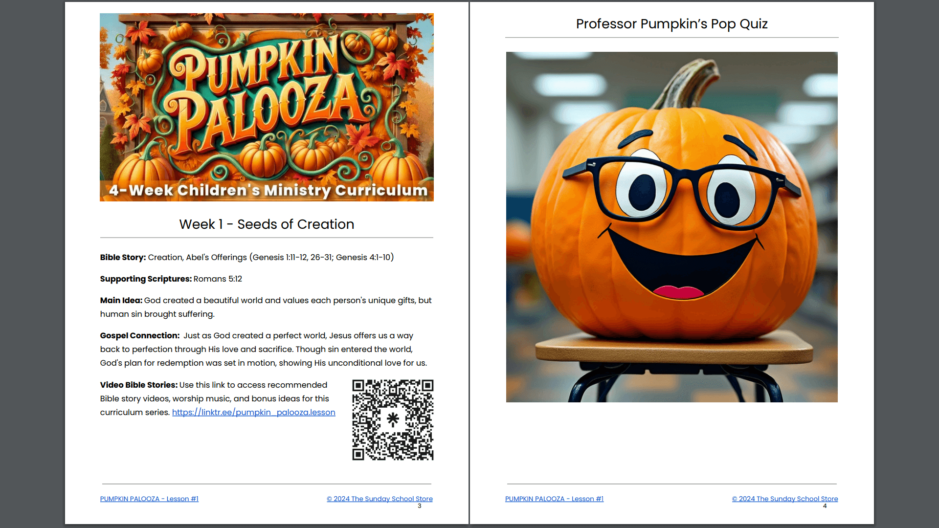 PUMPKIN PALOOZA is a 4-lesson children's ministry curriculum that celebrates God's creation and His abundant blessings during the fall season. Through engaging activities, pumpkin-themed games, and diverse learning experiences, children aged 6-12 will explore key Bible stories about creation, growth, gratitude, and God's plan for redemption.