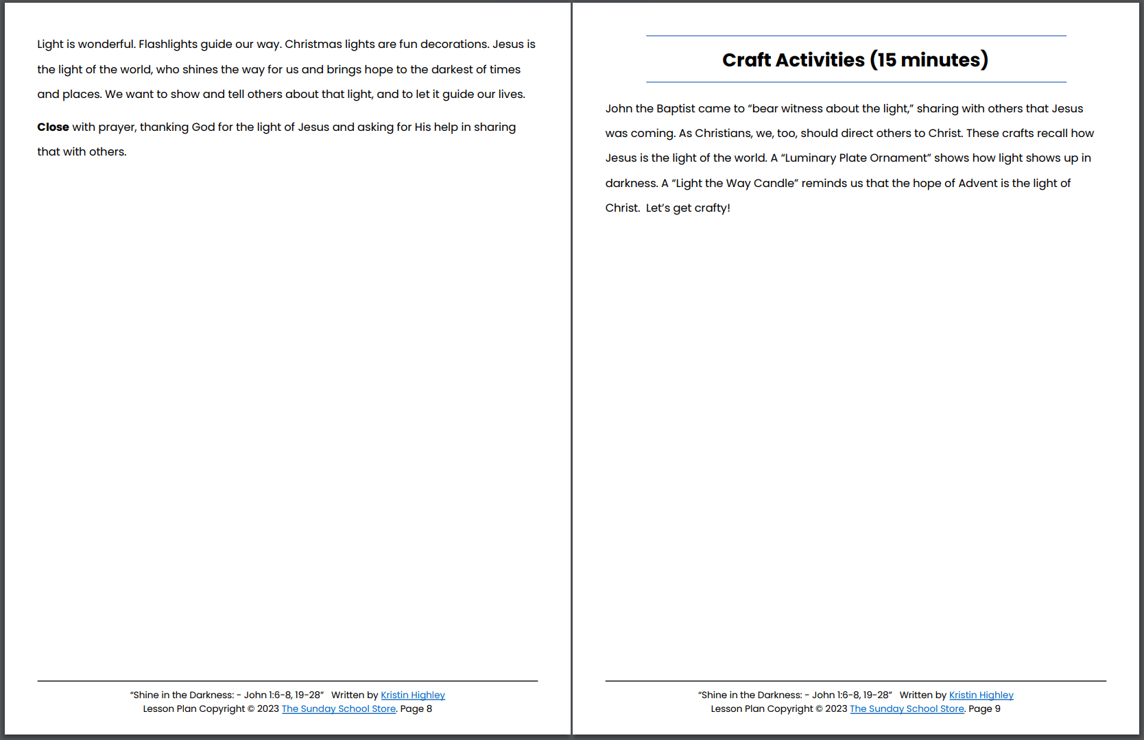 Jesus Christ is the light of the world, and gives us hope in the darkness of lifeās challenges. During the season of Advent, we celebrate His coming and remember how John the Baptist came as a messenger to prepare the way for Him. This lesson reflects on John and how, like him, we can share the good news of Jesus and tell others about Him, spreading His light. Christmas lights remind us of His light, and also act to illustrate how that hope and joy can be contagious to other people.Ā