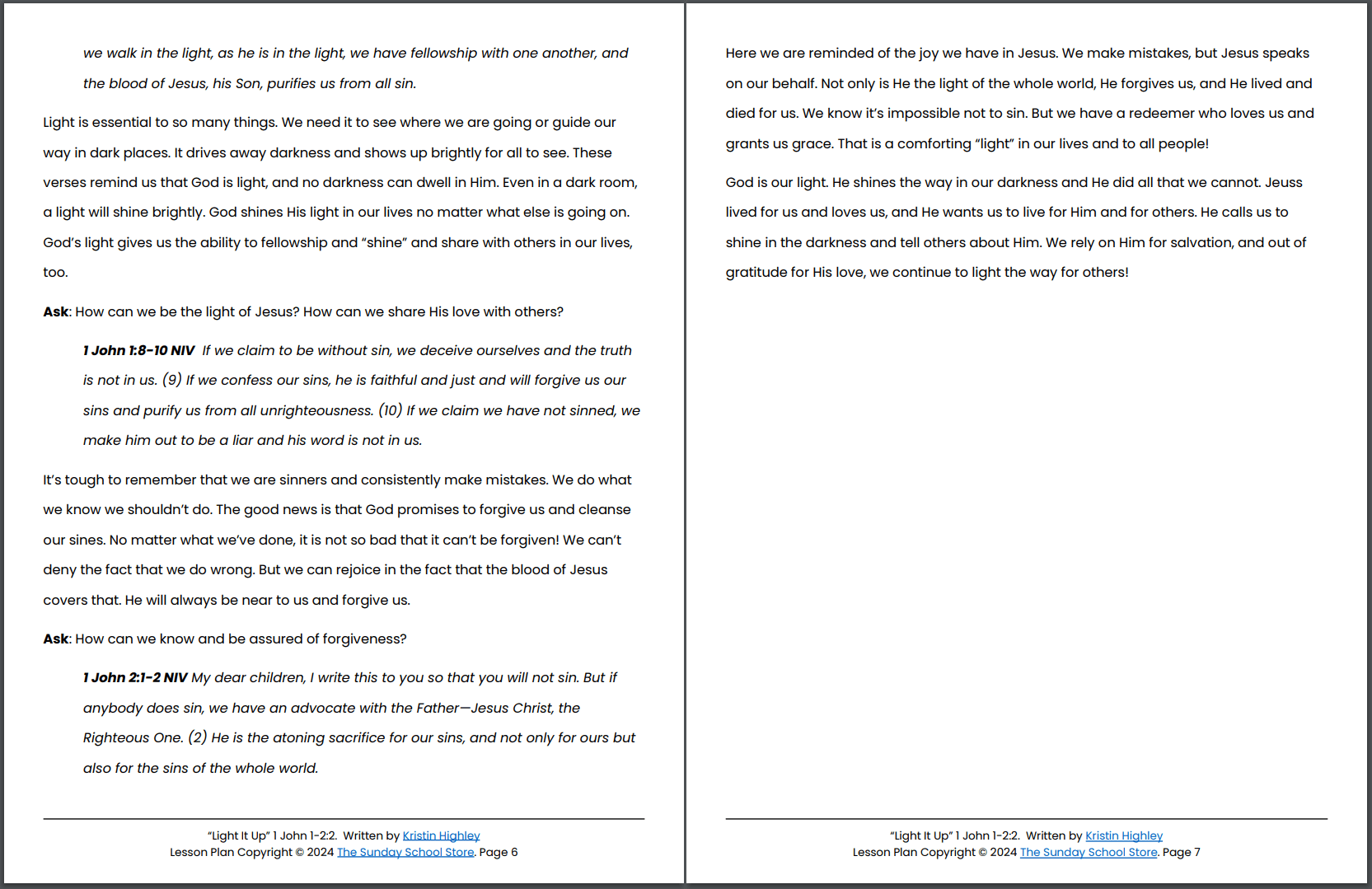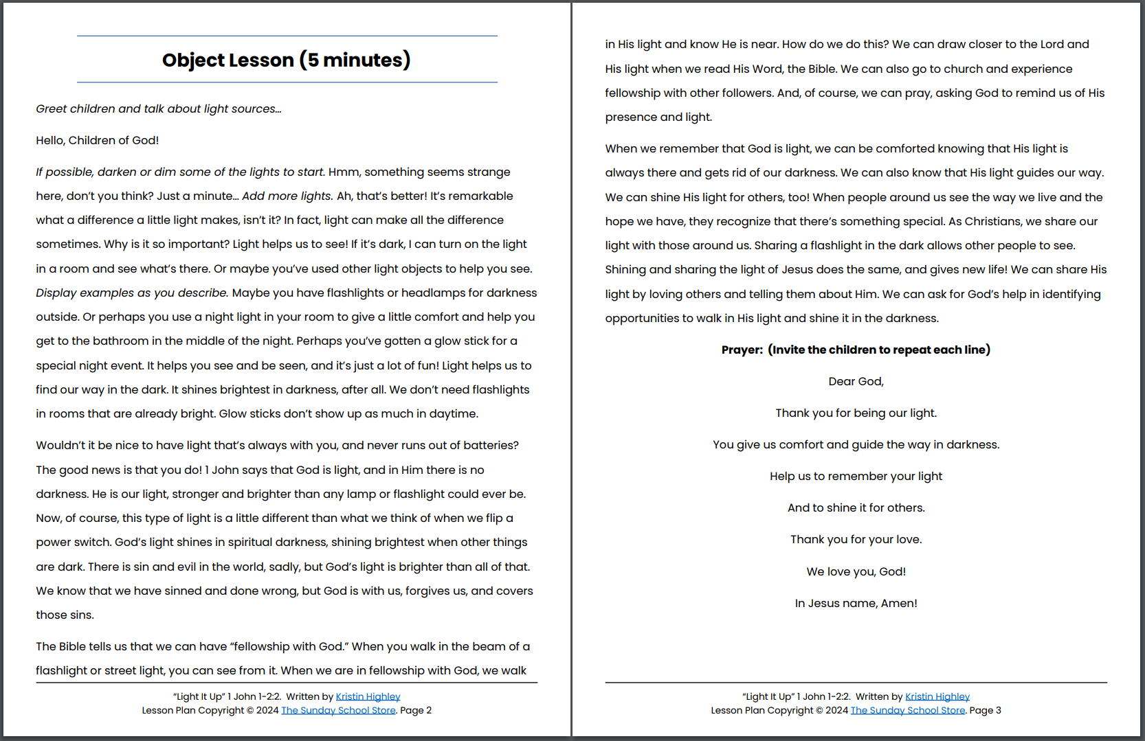 “Light it Up - 1 John 1:1-2:2” is a Bible lesson and activity resource for children. The lesson focuses on the importance of light, as a metaphor for God’s love and guidance. It encourages children to recognize that God is always with them, even in the darkness, and to share His light with others. The lesson includes a Bible study, object lesson, and activities.