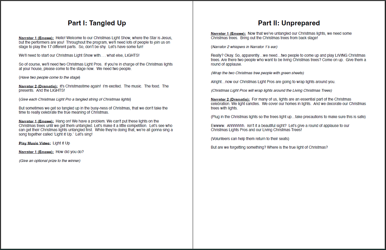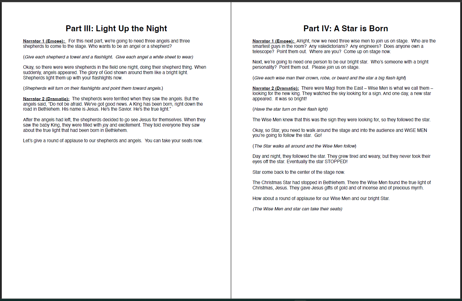 There are no rehearsals required for this Christmas Pageant.  This means the performers can be chosen at the time of the program. The only preparation required is reading through the program in advance so you know what you’re doing, getting a few props, making a few copies of it for the narrators and volunteers, and preparing the suggested music videos we’ve included in the download folder.  Please make the necessary adjustments to this program so it works best for your church.
